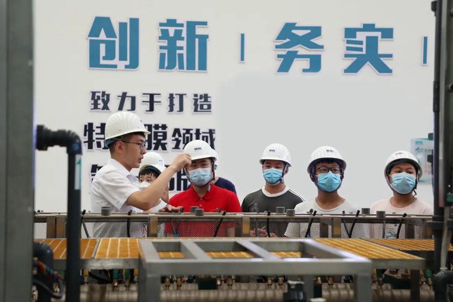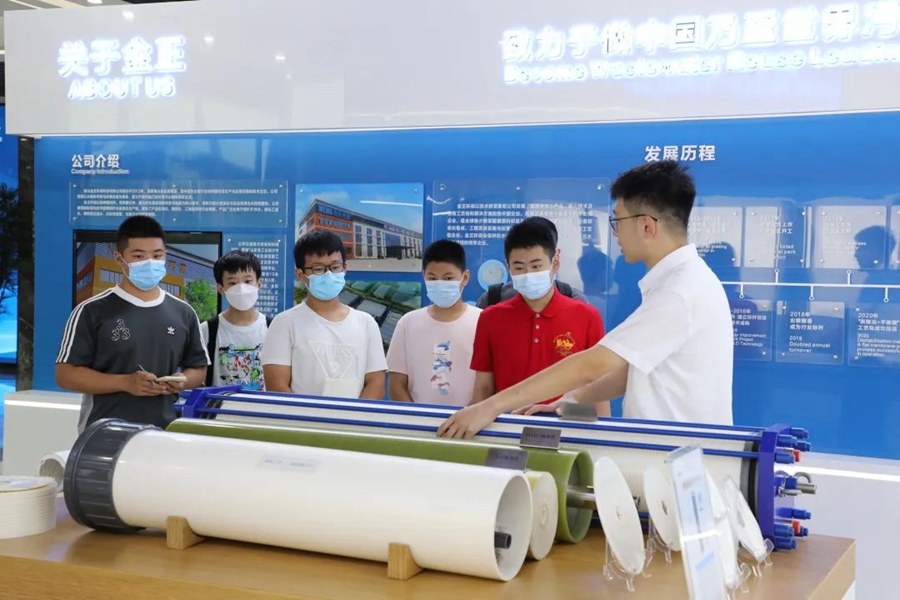 青少年志愿者們依次走訪了公司大數(shù)據(jù)中心、展廳、膜中心、組裝車間、研發(fā)實(shí)驗(yàn)室等地。在這里,志愿者們近距離了解,世界領(lǐng)先的污廢水資源化和高品質(zhì)再生水回用工藝技術(shù),實(shí)現(xiàn)年減排污廢水7300萬(wàn)噸;聆聽(tīng)“中國(guó)人用自己的工藝包”解決“卡脖子”的發(fā)展難題”,打破國(guó)外技術(shù)壟斷的項(xiàng)目故事;感知世界領(lǐng)先的“特種膜全自動(dòng)化生產(chǎn)線”,如何集聚工業(yè)互聯(lián)網(wǎng)、工業(yè)機(jī)器人、5G等先進(jìn)技術(shù),開(kāi)啟世界膜工業(yè)智能制造時(shí)代。