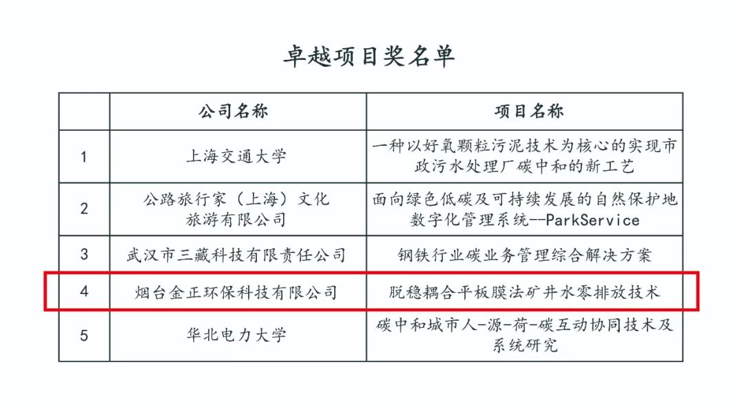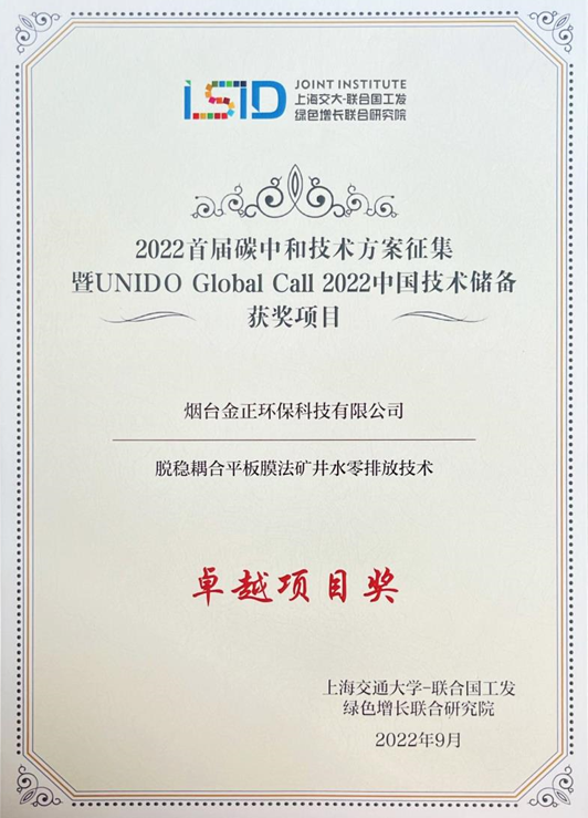 煙臺(tái)金正環(huán)保憑借環(huán)保水處理行業(yè)脫穩(wěn)耦合平板膜法礦井水零排放技術(shù)榮獲卓越項(xiàng)目獎(jiǎng),也是山東省唯一獲此獎(jiǎng)項(xiàng)的單位。