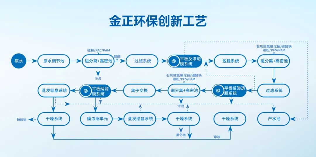金正環保煤礦礦井水零排放及資源化利用解決方案,以更短、更高效的流程實現礦井水深度處理及資源化利用,為煤礦及煤化工企業提供運行成本低、固廢產出量少、膜系統運行穩定的創新工藝。該工藝分為四個工藝段,依次是預濃縮工藝段、脫穩濃縮工藝段、深度濃縮工藝段、蒸發結晶工藝段。各工藝段可根據來水水量、水質進行不同的裝備和工藝組合,實現模塊化、標準化運行,有效解決傳統卷式膜元件易污堵問題,實現高倍濃縮和分鹽,減少蒸發量,大大降低蒸發投資及運行成本,保證系統整體穩定運行。相比傳統工藝,藥劑用量減少≥80%,軟化污泥產量減少≥60%,去除鈣離子≥70%,成本降低≥60%